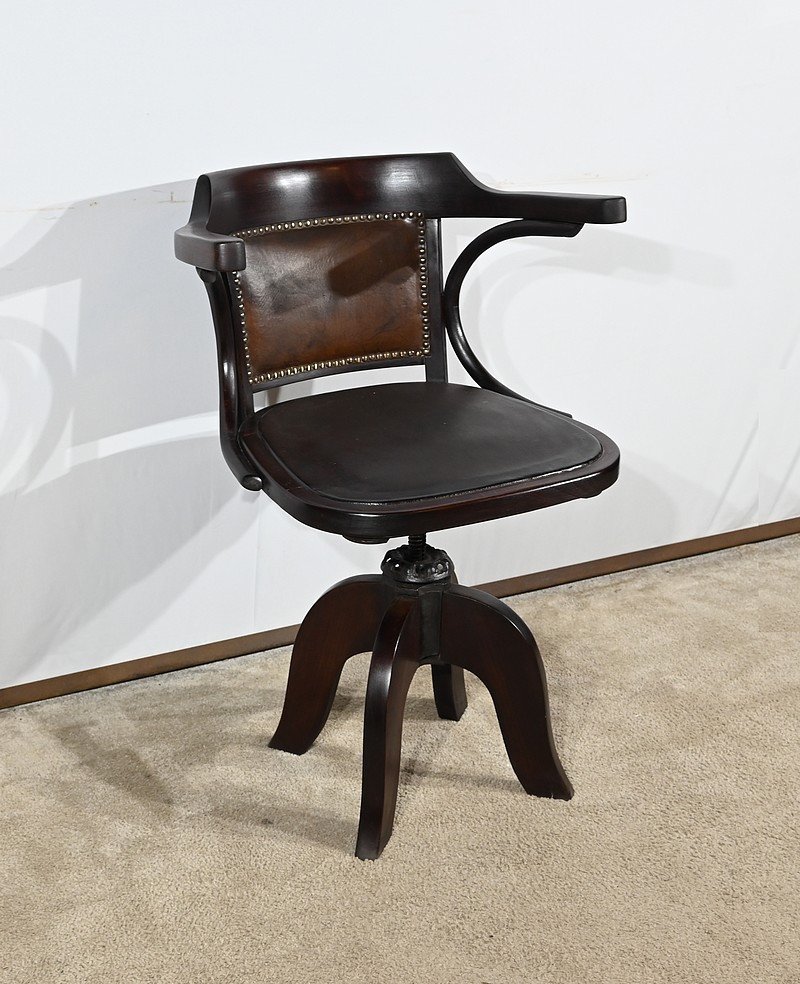 Swivel armchair in stained beech inspired by Baumann model no. 164. Dating from the 1940s, this armchair has a framed seat, darkened with thick black cowhide. The enveloping backrest has curved armrests joining the seat frame. The back is trimmed with a lighter brown, studded leather. This seat has a quadripod base. The four moving legs are joined by an iron element maintaining a sliding screw system, allowing this swivel chair to be adjustable in height. ******** Period: 1940 Excellent condition. Finish: waxed armchair on hard base. Additional photos available by clicking on the following link: https://www.antiquites-lecomte.com/boutique/sieges/fauteuil-de-bureau-pivotant-1940 Delivery possible, in France and internationally. Maximum dimensions: Armchair: Width: 59 cm Depth: 53 cm Height: 84 cm Seat: Width: 47 cm Depth: 46 cm Height: 51 cm Ref: 120124.2
