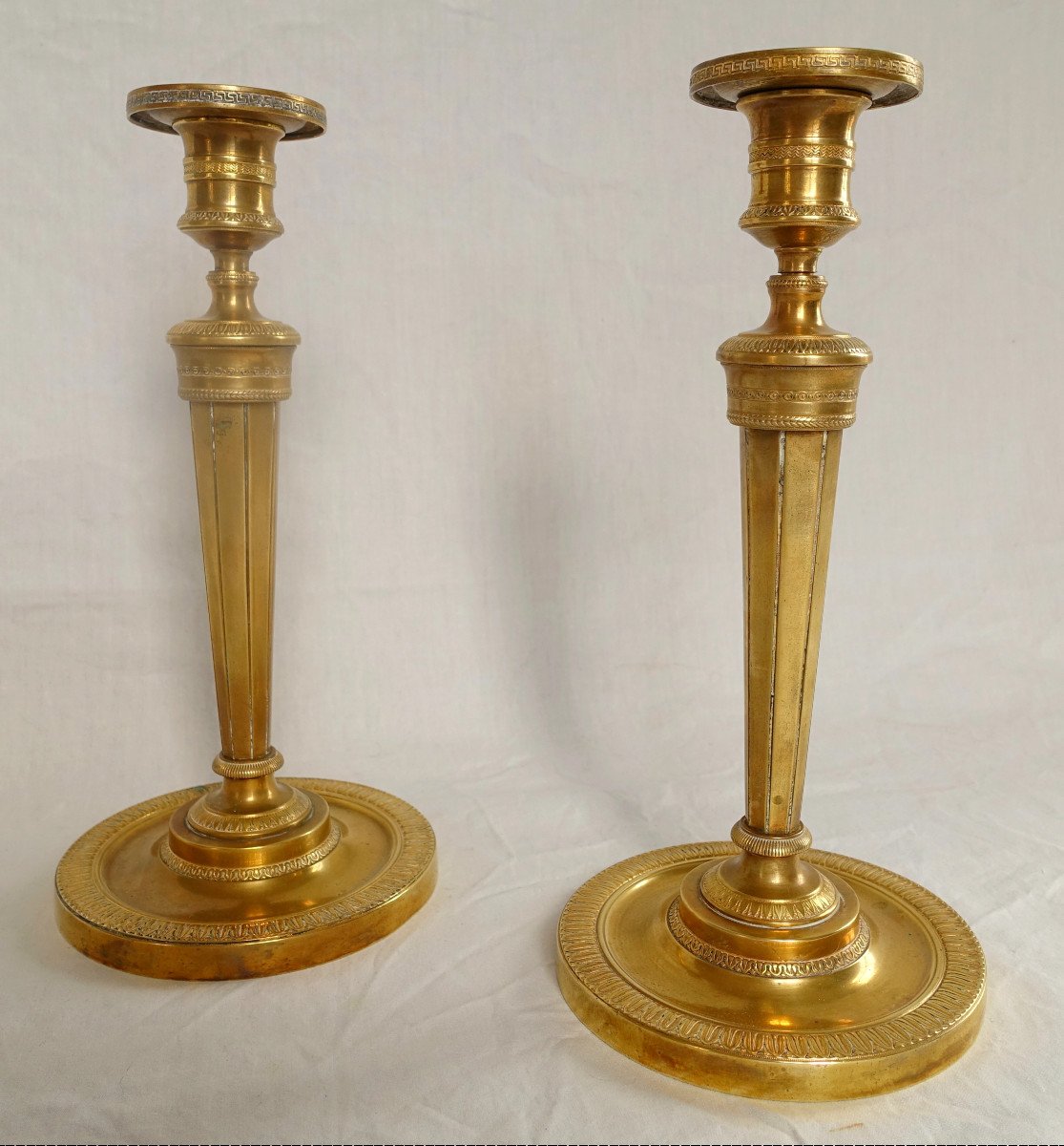 Pair of candlesticks or torches in bronze and mercury-gilded brass, Empire period circa 1810-1811, attributable to Claude Galle. Our candlesticks are of a model very close to the simple models ordered by the Imperial furniture store for the secondary apartments of the Château de Fontainebleau, "in the form of a quiver with knurled (molded) ornaments in matt gilded bronze" and show great similarities in details and finishes found on other identified productions by Claude Galle, which make this attribution very likely. This model is distinguished by its sobriety as well as excellent quality of execution. It is made up of 9 independent pieces. Original worn gilding, traces at the bottom of the carvings, confirming good quality during their design. Height: 26cm