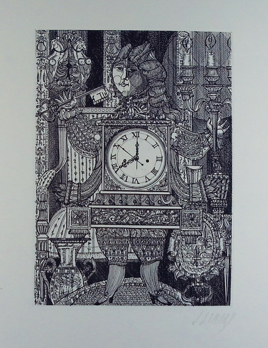 LINARD (Jacques) - Greeting card. Nancy, Jean-Pierre Couture, circa 1960; in-4, steel plate and 5 engravings, in sheets. Steel plate ready to engrave, 5 states of engraving of the greeting card and an engraving of the same format (180/130 mm). Greeting card made by Jacques Linard for the antique dealer Jean-Pierre Couture (father of Charles-Élie and Tom Novembre). A priori it is the proof with the engraving plate given by the artist to Jean-Pierre Couture.
