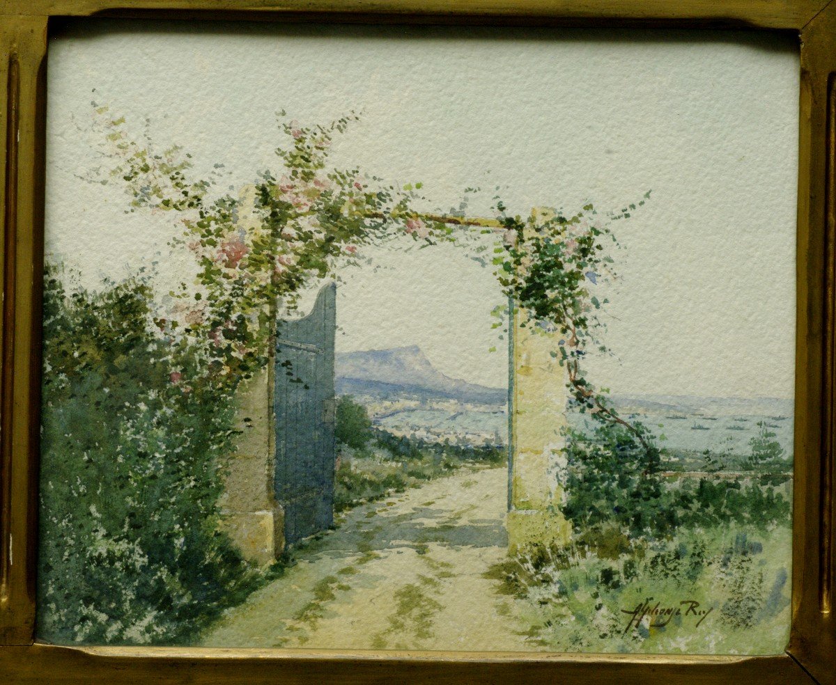 Three late 19th century watercolors in a triptych, framed under period glass, three views of the Mediterranean may be from the same property (to be searched?), all three are signed Alphonse Rey. Total size of the triptych 126.5cm x 36cm, size of the largest view 50cm x 25cm, the other two 30cm x 25cm. Condition: very good condition of the watercolors, frame with small chips.