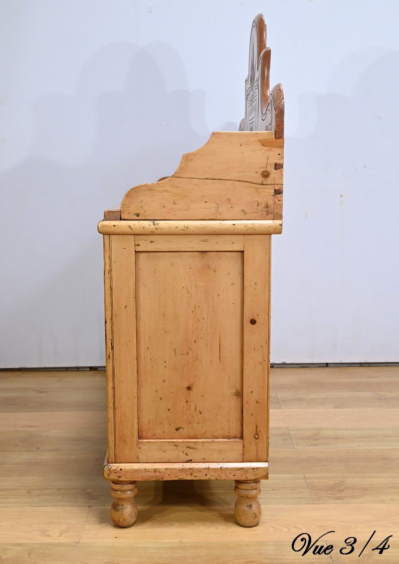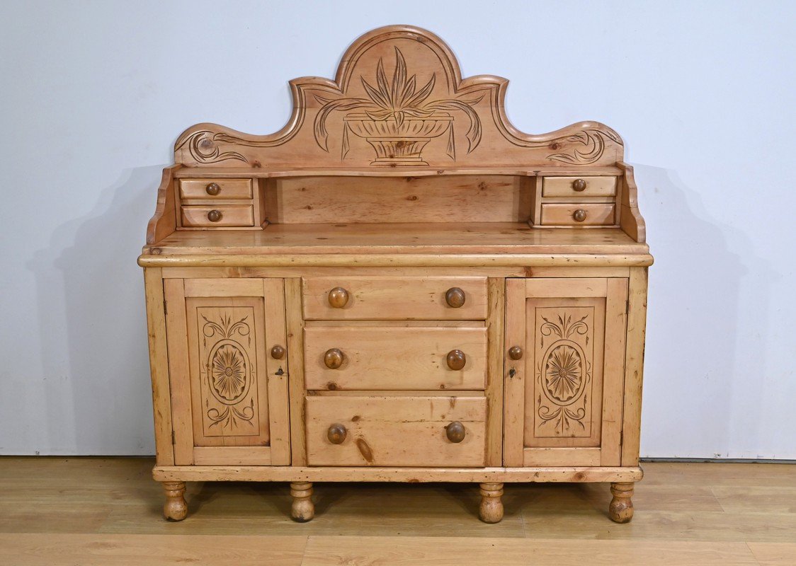 This sideboard from Wales is a classic example of Welsh craftsmanship, with carved floral designs on a decorative panel, with shelf, also called a splashback. It is made of pine, a wood appreciated for its warmth and natural grain. It opens with four small drawers with turned wooden knobs in the upper part and three larger ones, in the same spirit, in the central part of the body. The doors, each giving access to a shelf, are decorated with round wooden buttons, traditional patterns and equipped with functional original locks with their key. This sideboard rests on six turned legs which add to its rustic charm. It is a piece of furniture that stands out for its quality of manufacture, its carved details and its traditional Welsh style. ******** Period: Late 19th century Excellent condition Waxed finish Additional photos available by clicking on the following link: https://www.antiquites-lecomte.com/boutique/buffets/buffet-enfilade-en-pin- wales-1920 Delivery in France and internationally. Dimensions: Width: 145 cm Depth: 55 cm Height: 63.5 cm Ref: 582 M