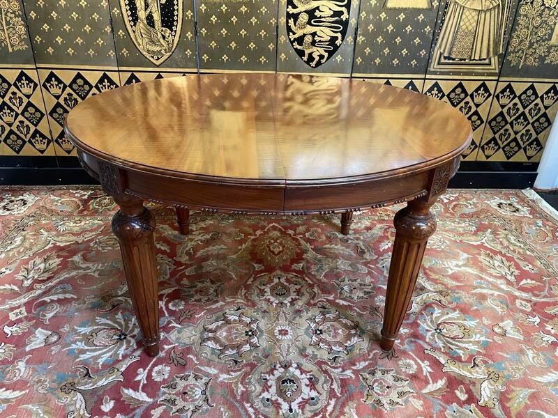 Louis XVI style oval table in solid walnut., Very beautiful thick base. The quality and condition of the table are exceptional… Comfortable headboard height of 63 cm! Two extensions of 50 cm each. Total 227 cm DELIVERY FRANCE €189 DELIVERY WORLDWIDE ON QUOTE We offer a selection of our items for the majority in perfect original condition or restored by our cabinetmaker craftsmen - upholsterers and gilders. A selection of items to be restored is also offered because we have a large stock and these items can be restored according to your desired finish by our craftsmen (choice of varnish - waxed furniture - armchairs and chairs with your fabric ...) We offer a very large choice of furniture and perhaps the one you are looking for is not present on our page but we have it in our 2200m2 warehouse where we welcome our very dear customers only by appointment in order to take the time together. We are located in 71270 Navilly in a magnificent 1900 factory and deliver worldwide. WE DO NOT NEGOTIATE ANY PRICE AT A DISTANCE WITH PAYMENT BY TRANSFER - DELIVERY ORGANIZED BY US AND WE ASK YOU TO RESPECT OUR CHOICE. See you soon.