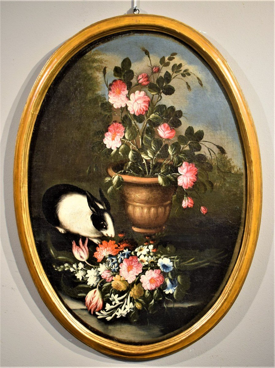 The two canvases are oval and of good size, painted by Francesco Lavagna (Napoli 1684-1724), a painter in Naples specializing in the production of still lifes of flowers .