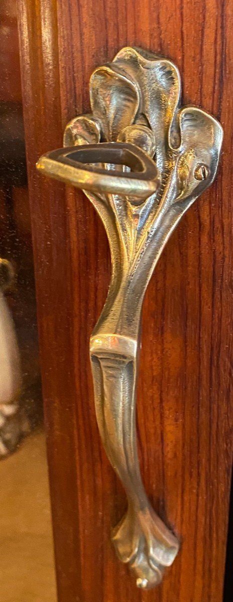 Library, display cabinet Ecole de Nancy in mahogany with seaweed decoration. Dimensions: 172 cm x 52 cm for a height of 243.5 cm. Internal depth: 44 cm