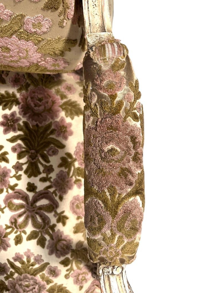 Very beautiful pair of armchairs à la reine in painted and gilded rechampi wood, molded and carved with volutes and stylized flowers. The legs are curved and arched with flower falls. Armrests with cuffs, curved and molded supports. Wide and deep seat, shell crosspiece. Very comfortable The armchairs are very well upholstered in a floral velvet in shades of pink and green. Rococo style - Louis XV style Napoleon III period - 19th century In the style of Nicolas Heurtaut received master in 1753, under Louis XV. Wear of the velvet on the seat of one of the two armchairs This pair of armchairs à la reine is part of a set, which can be sold complete or separately, also including a sofa and two chairs, which you will find in our gallery