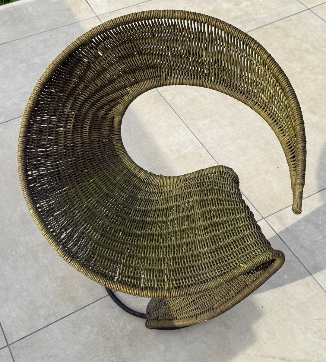 Fauteuil modèle zest par le créateur François Liguori. Fauteuil en fils d'acier enroulés garnis de rotin. Piètement Fer Forgé.