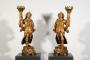 The sculptures depict two angels, with wavy and golden hair, lacquered complexion, dress with soft draperies and golden shoes. The two figures hold, specularly to each other, a large carved and gilded cornucopia, on whose upper end is inserted the bobeche in golden metal, which supported torches for lighting environments. The two angels rest on a carved wooden base with volutes and gold, with four lacquered ferini feet, and on the front side, the faces of a cherub lacquered with golden wings, which frame the profile.