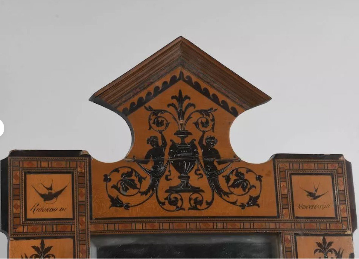 A fine example of an Italian Renaissance style frame dating from the second half of the 19th century in wood marquetry. The marquetry inscription "Ricordo di Montecatini" can be read. In its center a mirror from the same period.