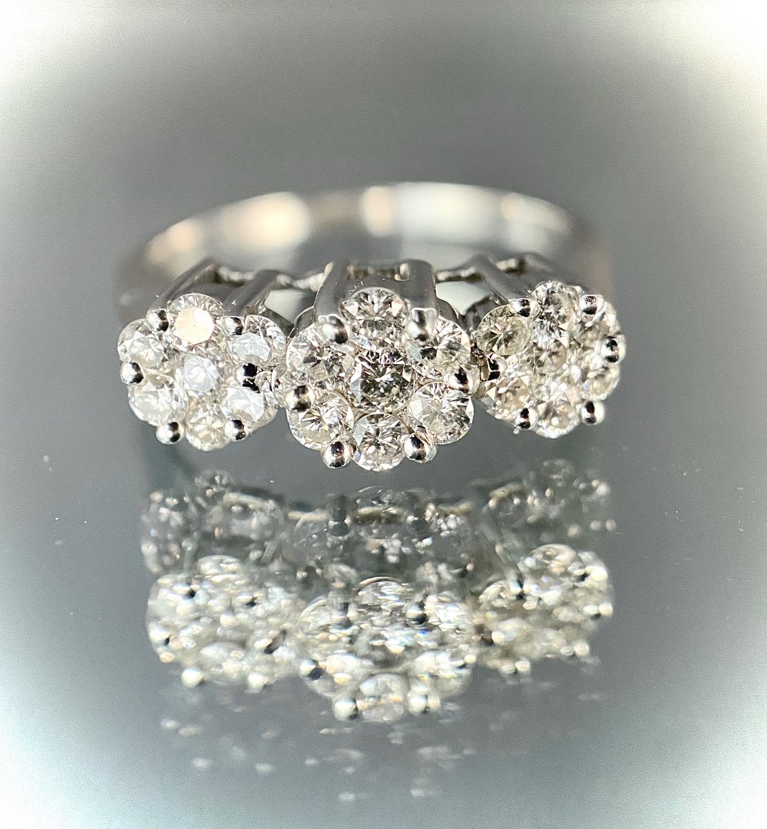 18K white gold ring set with 21 brilliants totaling approximately 1 carat (VS/SI – G/H). Hallmark: 18K Metric finger: 60 Weight: 4.9 grams D: 18 x 6 mm