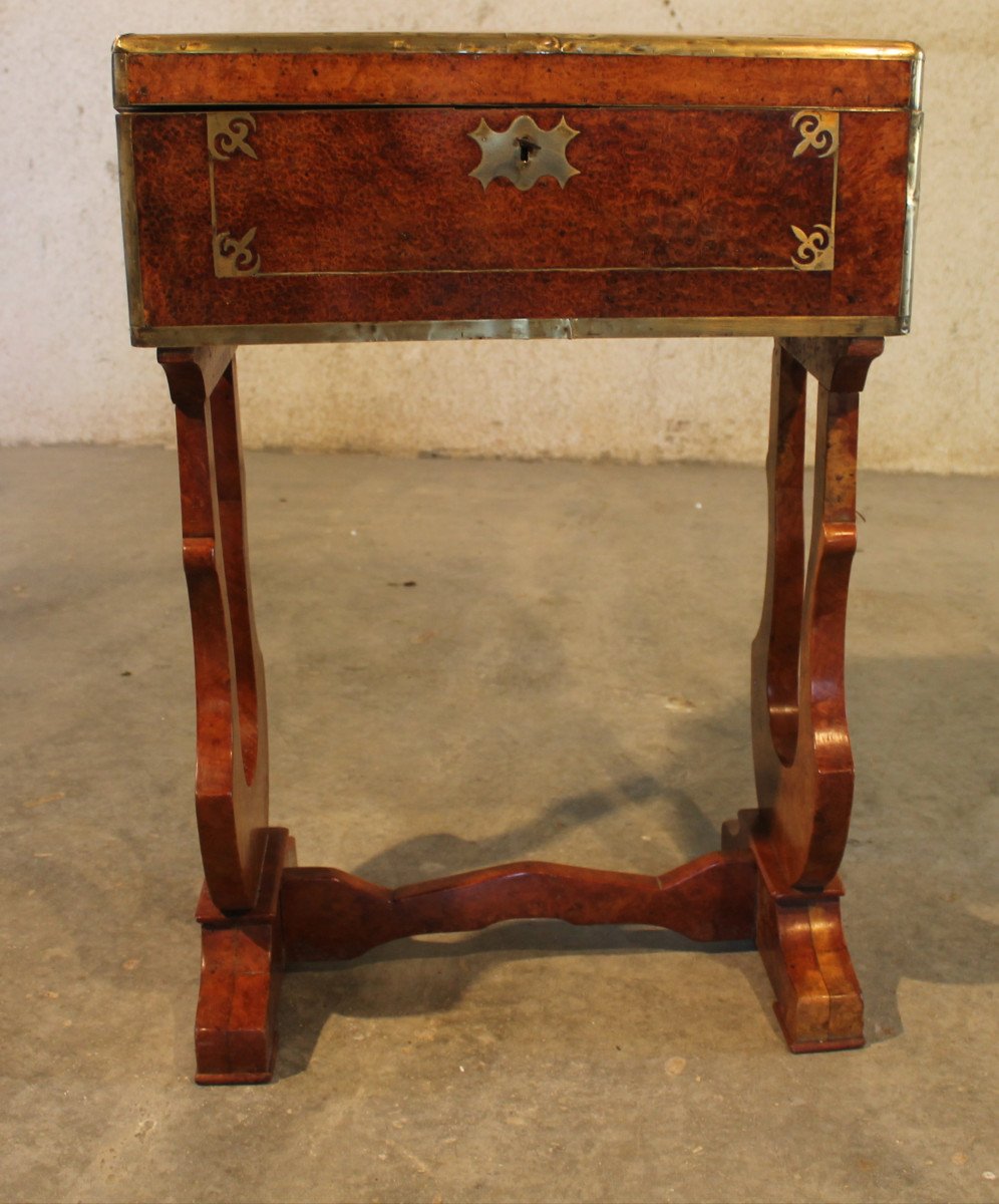 Lovely little Charles X transformation desk in burr walnut Lyre-shaped base connected by a scalloped spacer Burr walnut wood Desk chest trimmed with brass around the edge as well as on the front and top Side handles that fold down for transport When the chest is opened, it reveals a beautiful writing desk with its inkwell compartments, its pen holder, its pen box with its lid and a bone fretel The desks rise to reveal a large storage chest The pen section can be removed to reveal a secret compartment Original lock that works Note: the old felt may need to be changed The flap has an internal closing system The top is slightly warped but this does not spoil the whole h: 69.4 cm w: 47.5 cm d: 28.5 cm Open writing desk: d: 57 cm w: 47.4 cm h for the Leg clearance: 52 cm