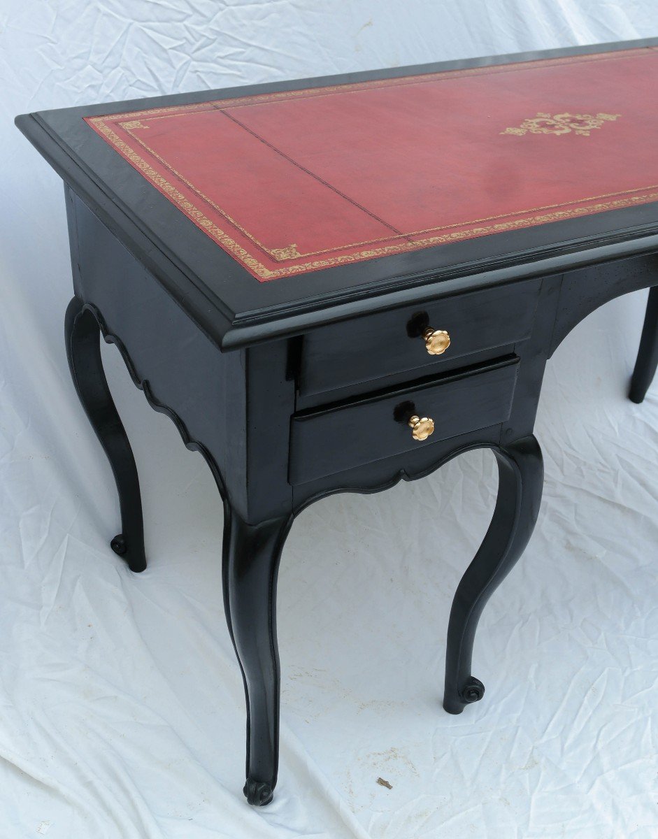 The top is covered with a magnificent red leather with numerous gold decorations and inlays in perfect condition.