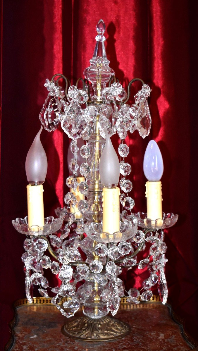 Beautiful girandole lighting by means of four light arms. Our light rests on a circular bronze base and finely crafted in the Louis XV style. The arms are equipped with gadroon-shaped glass cups decorated with tassels, plaques and pearl garlands. The whole is topped with a removable saber fitted at the top on a brass rod (see photo). The electrification is not new but in very good working order. Dimensions: height 54 cm Shipping costs contact us.