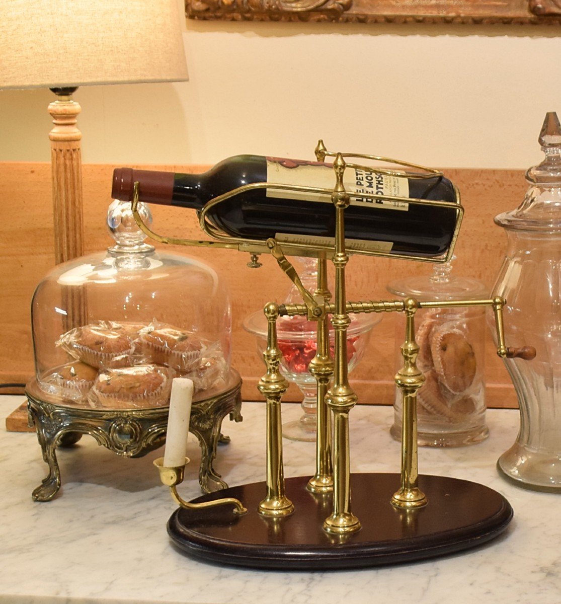 Candle decanter, crank on rack, in gilded brass on blackened wooden base. French manufacture from the 1980s of beautiful quality. Complete and in very good condition. Length 36 cm, width 22 cm, height 37 cm. 2.900 kg.