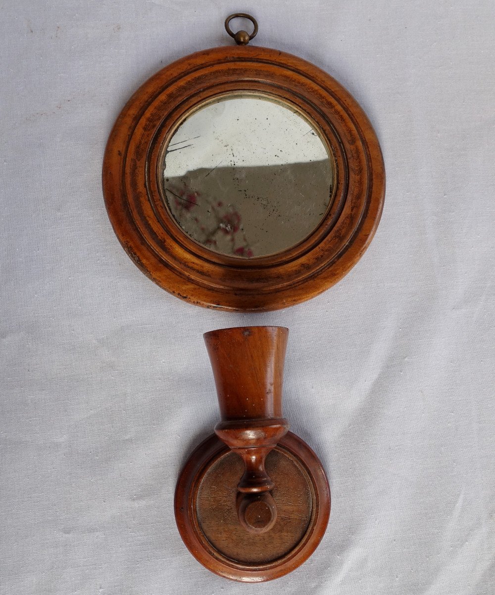 wall lamp, carved boxwood light arm, it is coupled with a circular mirror to reflect the light of the candle. Antique work from the 19th century, ideal to complete a 17th century decor, a cabinet of curiosities. Mirror diameter: 17.5 cm Candlestick height: 14cm