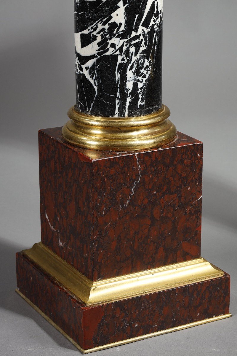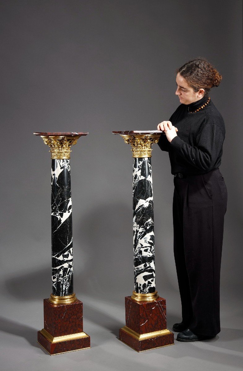 Pair of grand antique marble columns, Corinthian rings and capitals in chased and gilded bronze resting on a base and tablet in red griotte marble. Provenance: former collections of the Dukes of Fitz-James and by alliances.