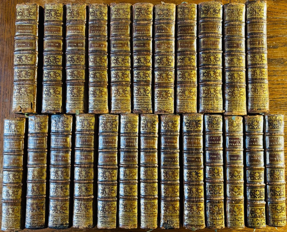 [GAYOT DE PITAVAL (François)] - Famous and interesting cases with the judgments that decided them. Followed by Continuation of famous and interesting cases. With the judgments that decided them By MJC de la Ville. Paris, Chez Cavelier then for the 4 volumes of the Continuation chez Desaint, chez Despilly et Rey, 1739-1770; in-12, approximately 500 pp. per volume, full marbled calf binding of the time, spine decorated with 5 ribs, marbled edges. The 24 volumes. Rare complete series given the complexity of this edition between the duration and the fact that there is a different publisher for each supplement volume. This series contains many cases such as: Martin Guerre, Saint-Géran, Urbain Grandier for the famous Possession of the Ursulines of Loudun, Cinq-Mars, volume XIII contains "Freedom claimed by a Negro against his master who brought him to France", followed by the Code Noir, Montmorency, the quarrel of Furetière with the verses of La Fontaine, etc... Good condition.