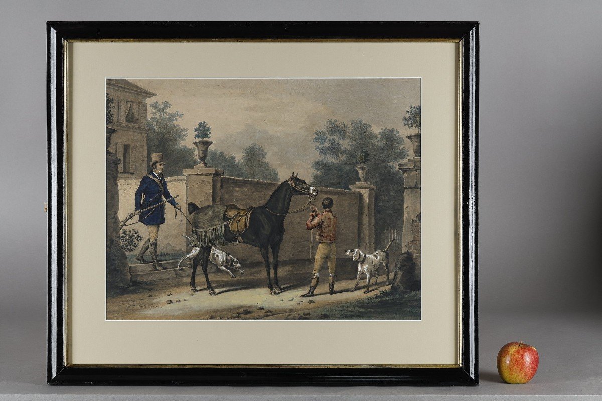 The second engraving depicts an aristocratic hunting departure scene. It features an elegant hunter in a blue suit, his horse held by a groom, and two hunting dogs in a neat architectural setting...
