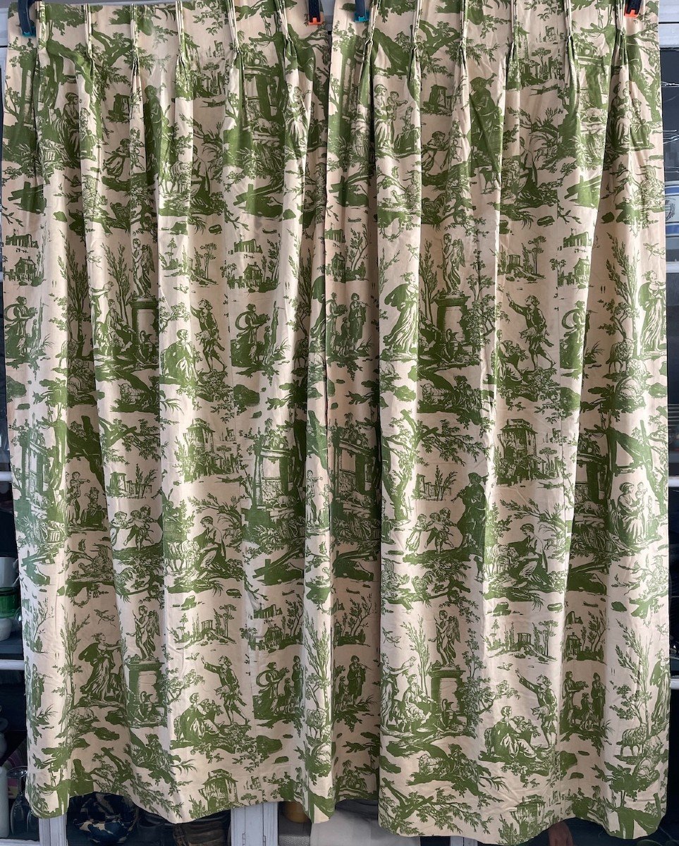 192 cm x 121 cm I am selling a lovely pair of vintage Toile de Jouy style curtains, with a refined pattern and a soothing green hue.