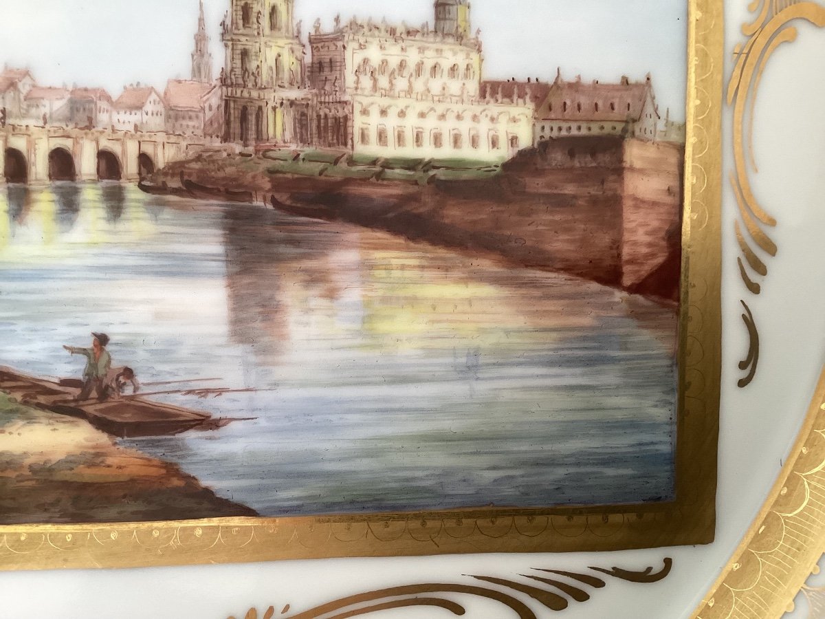 Important and pretty German porcelain dish with five hand-painted cartouches depicting various views of the city of Dresden, highlighted by a pretty engraved gilt decoration, mark on the back in blue, 19th, in perfect condition.