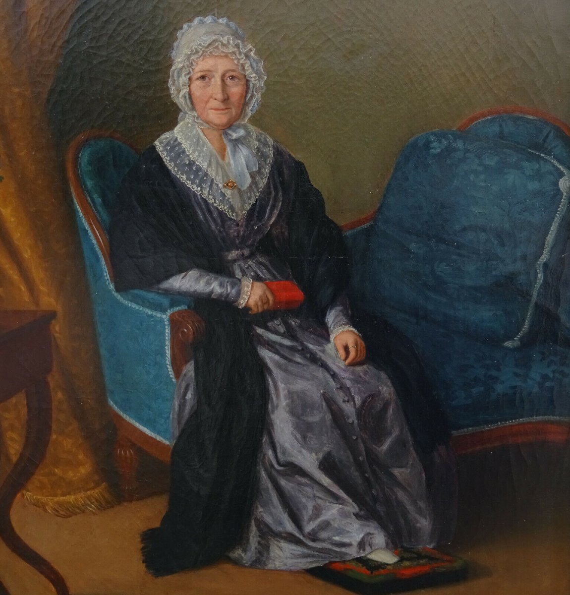 She is represented seated on a sofa wearing a beautiful dress with a fine lace collar.