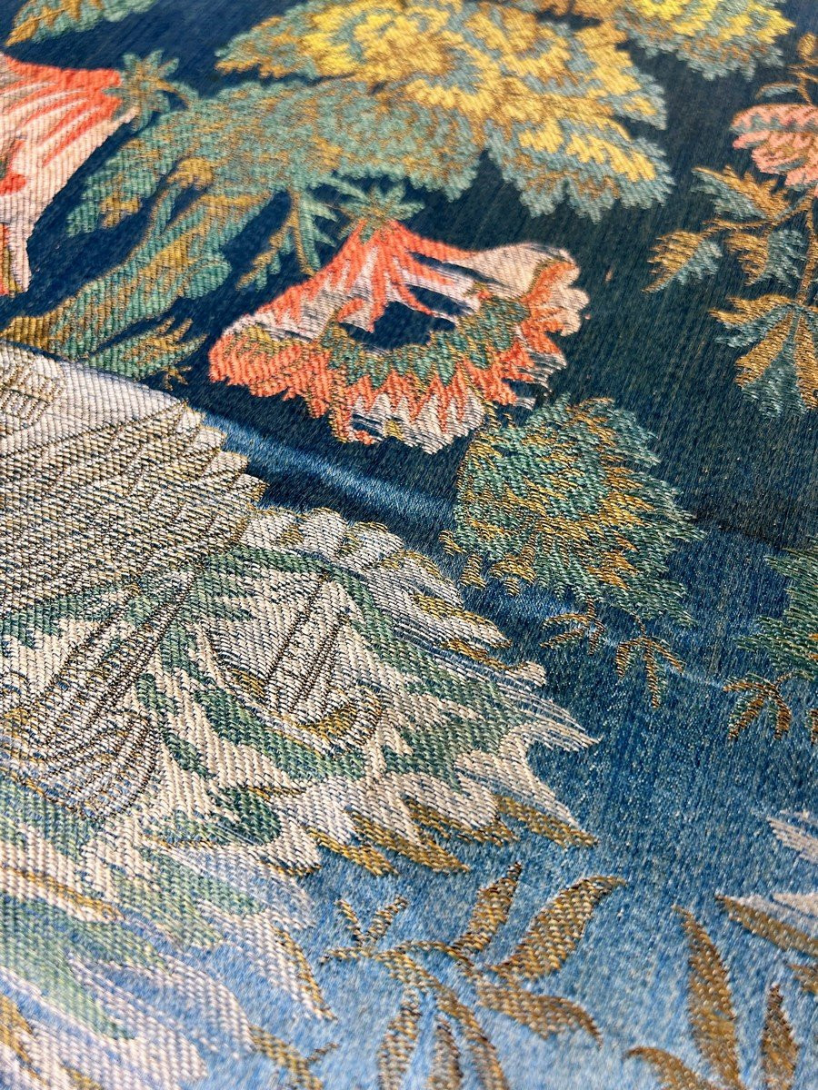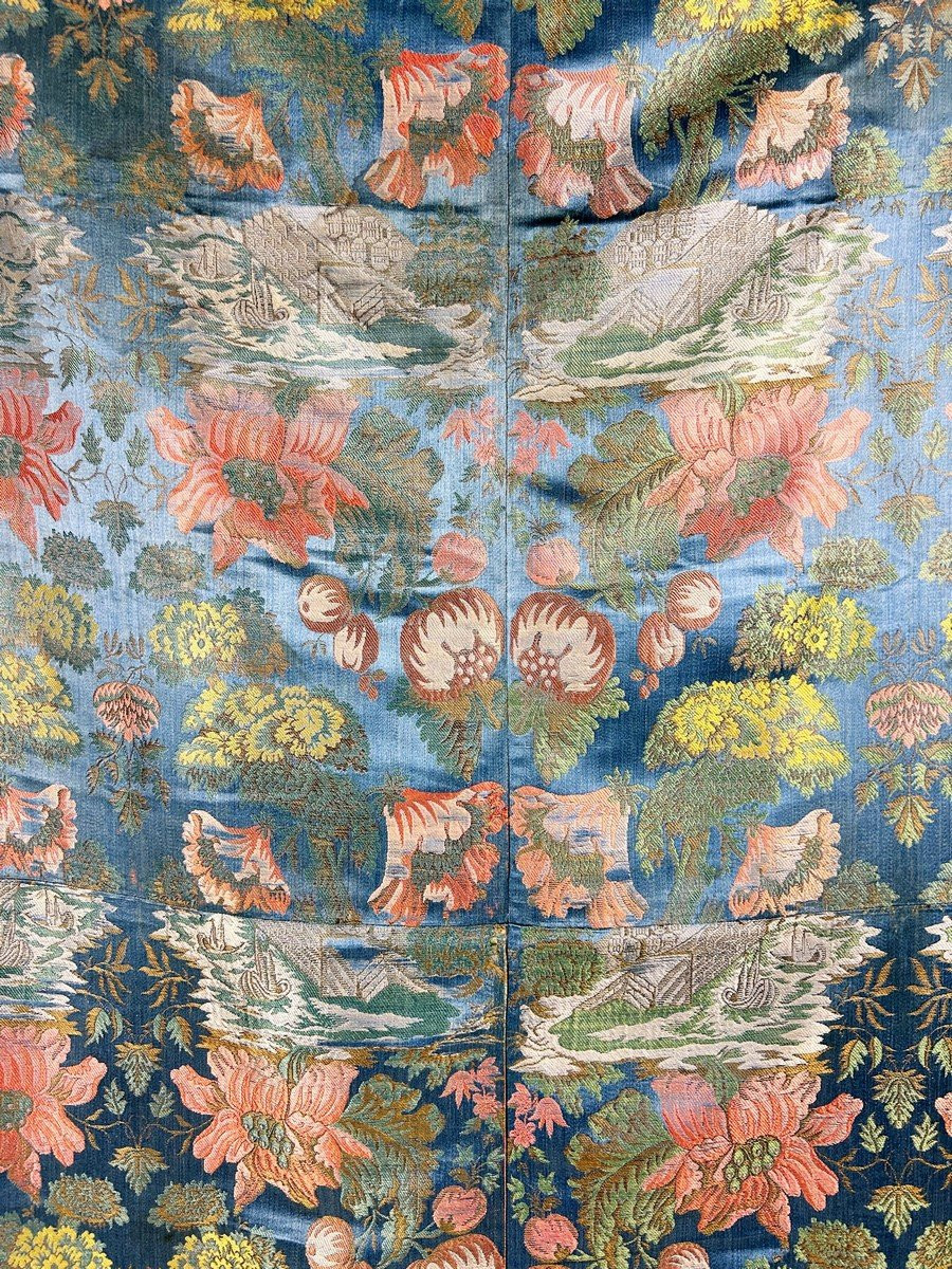Circa 1720-1730 Holland A lampas panel called Bizarre with a floral and naval composition dating from the beginning of the 18th century and most likely from a Dutch factory. It consists of four sewn strips (56 cm wide with selvedges) in brocaded edged lampas on a blue marbled satin background. The Netherlands, thanks to the East India Companies (VOC), dominated the maritime routes with the English in the 17th and 18th centuries, as suggested by the design of this silk with its design of galleys and fortifications. The Baroque floral repertoire with greenery, pomegranates and massive trees, remains borrowed from the Rococco taste, here very emphasized, in which the Dutch excelled. No defects to note apart from a few halos only visible on the reverse. Exceptional condition of colors and preservation. Dimensions: 195 cm high x 111 cm wide. Strips 56 cm wide