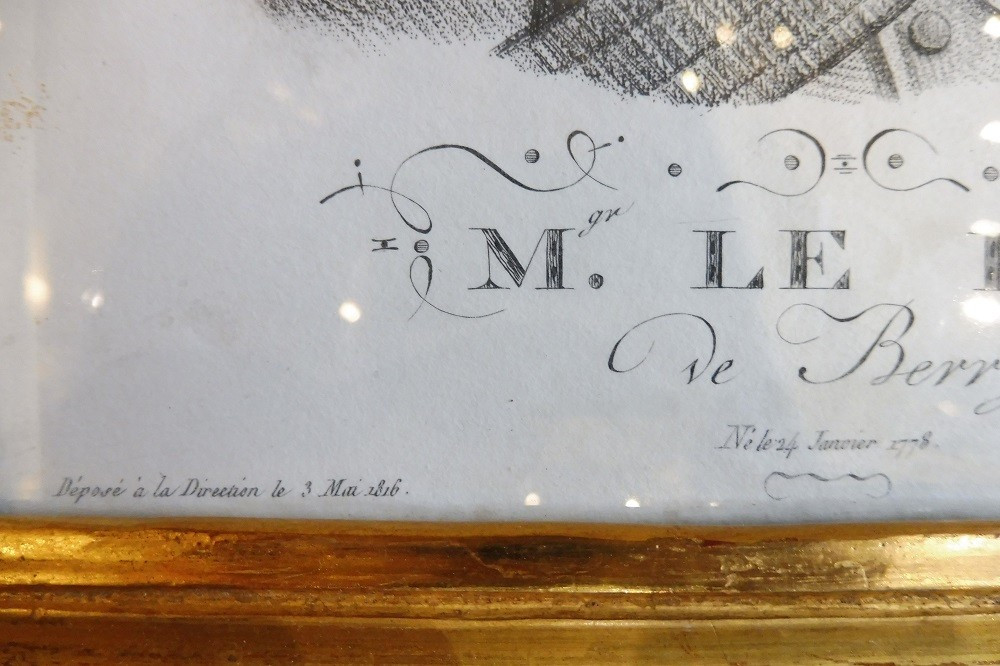 Black and white engraving from the beginning of the 19th century representing the portrait in bust of the Duke of Berry, presented in its gilded wooden frame and behind its old glass.