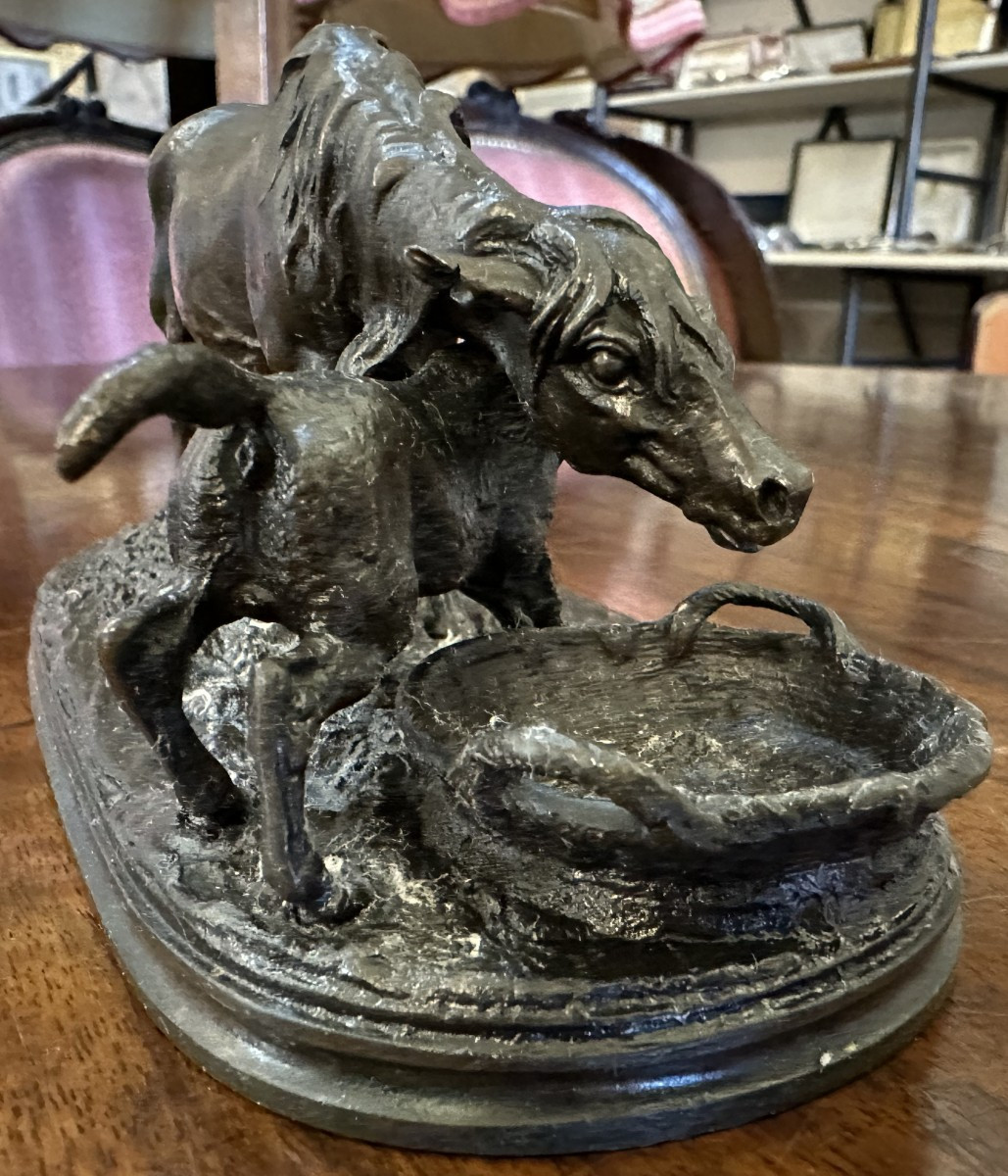 "Small Bronze Sculpture Of A Mare And Her Foal Near A Basket By Pierre-jules Mêne, 19th Century"