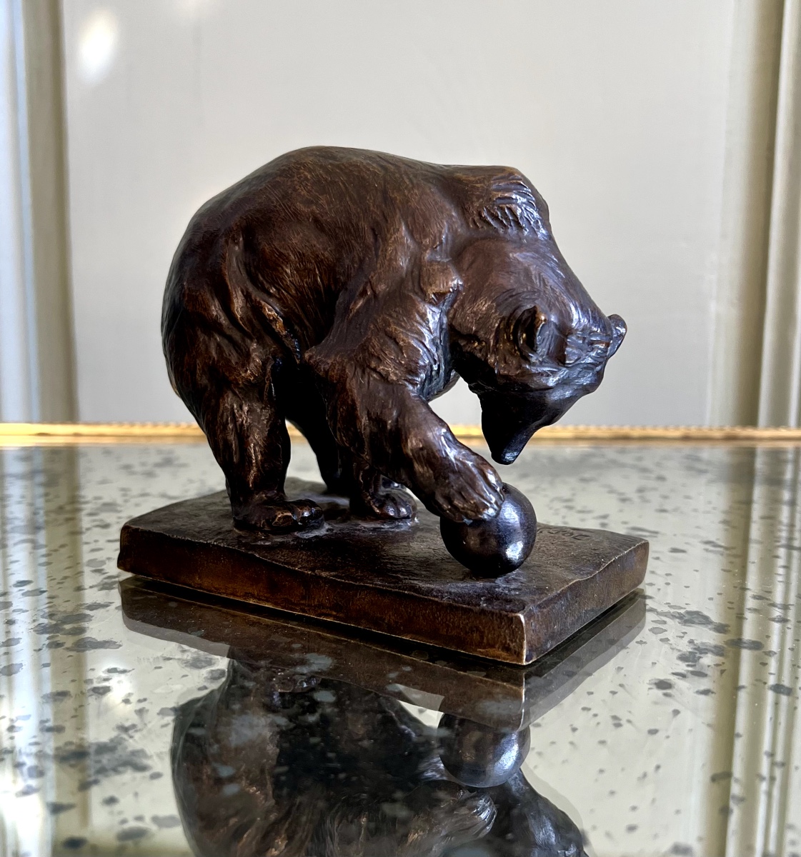 A casting of fine quality in both execution and chiseling. Josef Pallenberg (1882-1946) is one of the most famous — though not widely recognized by the general public— German animal sculptors of the twentieth century. Being a child of his era and discipline, Pallenberg was deeply influenced by zoology and amassed a large collection of natural history himself; this allowed him to transcend the boundaries between the disciplines of zoology and art history.The animalier mainly observed indigenous and exotic animals’ behaviour and habits at the zoos in Cologne, Düsseldorf and Berlin. He also regularly took educational trips, amongst others to his brother in the United States, where he attended several animal shows enabling him to study social behavior of those featured. Additionally, Pallenberg lived with several wild species such as lions, wolves, gazelles, bears,…. gaining firsthand experience of their conduct and demeanor. Several private photographs show Pallenberg with young bears, illustrating his close relationship with these animals.According to contemporary sources he was designated as the ‘master of shapes’ with a great sense of ‘naturalism’. Pallenberg realized numerous European and American commissions.Literature and model in: Bartelmus, Martin and Stefan Schweizer. Der Tierbildhauer / The Antimal Sculptor. Jozef Pallenberg 1882-1946 (Berlin: Deutscher Kunstverlag, 2020), referenced model p109, n°43 Bär, mit Ball spielend (stehend).