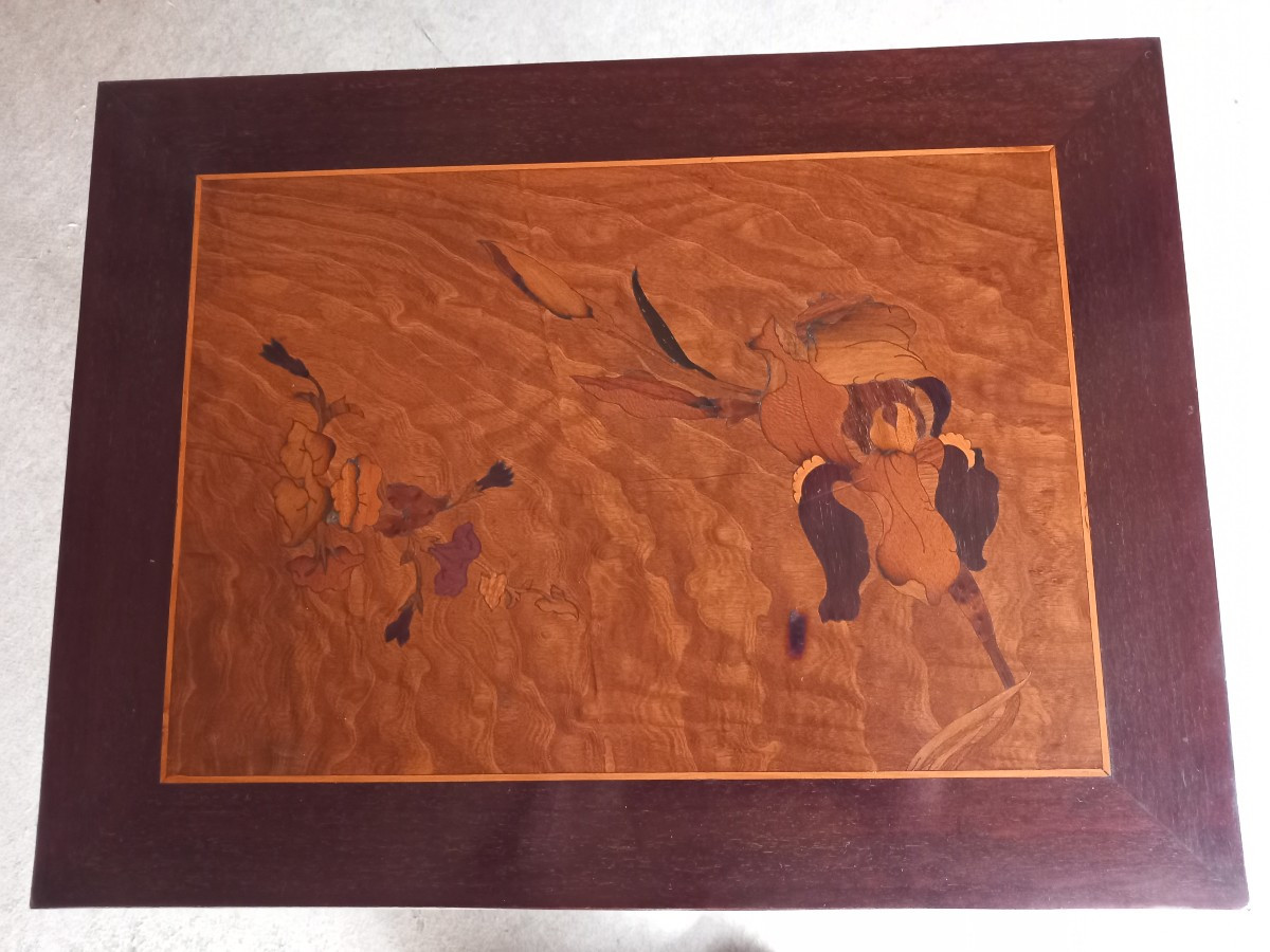 This set of four Art Nouveau nesting tables is made of light and dark mahogany. It is decorated with orchids, carnations, irises, poppies and rests on a base with two runners. The upper table, with 'bec de corbin' edges, is supported by two flared legs with marquetry decorations of foliage, and connected by a crosspiece. The smallest (the lowest), with straight edges, has an 'H' shaped base, on two flared 'X' shaped legs also connected by a crosspiece, like the other two tables. Beautiful work from the School of Nancy, in very good condition.