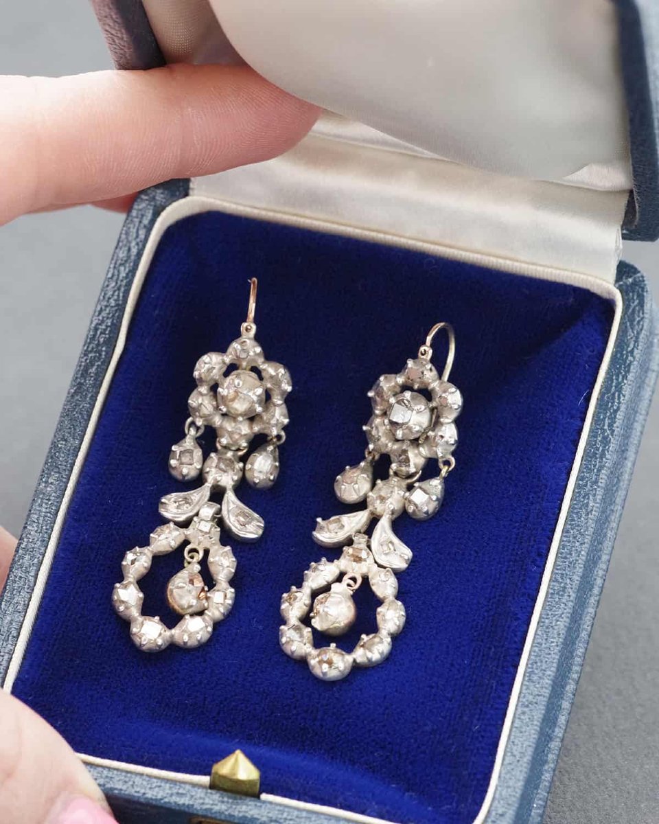Provençal diamond drop earrings in 18 karat gold and silver. Pair of pendants set with antique table-cut diamonds. The diamonds are set in a silver mount in a setting typical of this regional jewelry. The clasps are made of gold. The back of the earrings is partially gilded with gold leaf. Arles earrings, regional jewelry, 19th century, France.