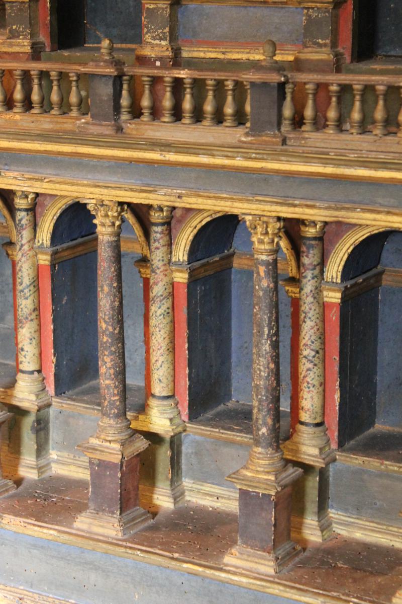 curiosity cabinet Wood polychrome A Baroque architectural decoration on two levels In the lower part, five niches flanked by engaged columns are behind a colonnade painted in imitation of marble with gilded Corinthian capitals. In top three niches also flanked by engaged columns, a central hand colored and topped with a pediment, are presented on a terrace surrounded by a golden railing. 107 cm tall; 94 cm wide; 26 cm depth of the seventeenth century Italian Job Small lacks, worm holes