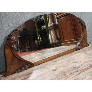 Art Deco period panoramic mirror, adorned with solid wood carvings depicting flowers, fruit, and foliage in high relief. Beautiful central curve typical of the style, with flowing, organic lines. Original beveled glass, walnut frame with a warm patina. Specifications: Period: early 20th century; Style: Art Deco / naturalist; Walnut; Large width: ideal for above a fireplace; Antique glass; A very elegant decorative piece, perfect for enhancing an entryway, living room, or bedroom with character. H 68 x W 169 x D 6 cm