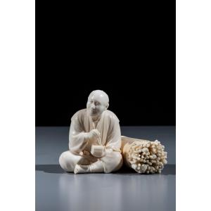 An ivory okimono of the Tokyo school, depicting a woodcutter seated during a moment of rest, holding a bento box and chopsticks in his hands.
