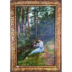 Charming oil on canvas, elegant woman resting, seated by the roadside. Oil on canvas, French School, circa 1880. Small chip on the frame, otherwise very good condition.