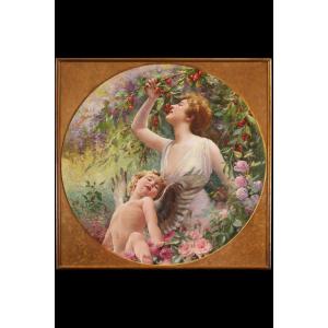 Spring, represented by a young woman with blond hair, appears awakened from a sweet torpor; the figure is portrayed in three-quarters, in the act of raising a bunch of ripe black cherries to her lips; behind the fruit branches, we can glimpse a cascade of wisteria flowers. The base of the tondo is decorated with roses and buds, while a cupid with golden hair seems to look down on us. The composition is characterized by light, luminous tones, such as pink and lilac; the lush nature is defined by a pale green, in a low-contrast palette.