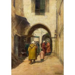 The work depicts a scene of daily life set in a historic village, characterized by stone architecture and an arched passageway that dominates the composition.