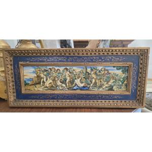 Beautiful polychrome majolica tile with a scene of cherubs, made by the Molaroni factory in Pesaro in the early 20th century.