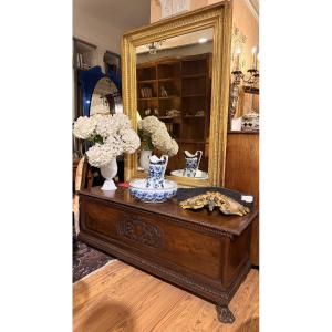 Tuscan Renaissance-style walnut cassapanca (bench chest), dating to the late 19th century. A piece of strong presence, featuring a solid construction and a richly carved front with foliate motifs and a central medallion. The hinged lid opens to a spacious storage compartment, originally intended for linens or valuables. Molded base resting on carved paw feet, typical of Renaissance tradition. Warm, even patina highlighting the walnut grain. Ideal as a statement piece in an entryway, living room, or at the foot of a bed. In good overall condition, with age-appropriate wear.