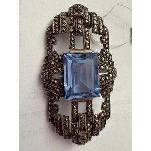Very beautiful solid silver brooch (Minerva hallmark) set with marcassittes and decorated with a blue synthetic stone. Total weight: 17.12 gr Height: 2.8 cm by 5.4 cm wide.