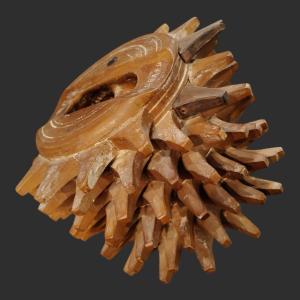 Beechwood bracelet for the game of "pallone col bracciale." Pallone col bracciale was very popular in Italy during the 18th and 19th centuries, as well as in the 20th century up until the 1930s. It was even the most popular sport of all; its first regulations date back to 1555. Pallone col bracciale players are called pallonisti. In the 19th century, Italian players were the highest paid and most admired athletes. This sport and its champions were described by Johann Wolfgang Goethe and Giacomo Leopardi. The balls are returned using a kind of stick worn on the forearm called the bracciale (literally, "bracelet" in Italian). If used incorrectly, the bracciale can cause arm fractures because it weighs between one and two kilograms. Originally, the ball was filled with air and weighed 934 grams, but now solid rubber balls weighing 350 grams are used (cit. Wikipedia). This model was built in Emilia-Romagna, in Bubano, between the late 19th century and the first decade of the 20th century.