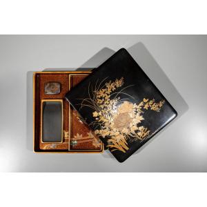 A Maki-e Lacquer Suzuribako With Peonies And Irises On A Black Ground