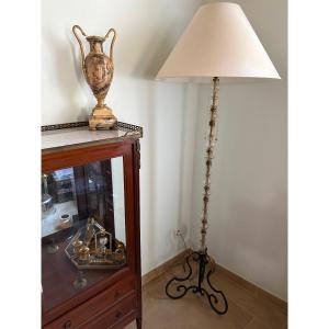 Floor lamp resting on a tripod wrought-iron scroll base decorated with acanthus leaves. The central shaft is composed of crystal elements alternating spherical and piriform shapes interspersed with gilded brass rings.
