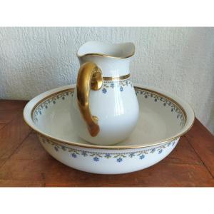 Limoges Mandavy De Mavaleix Grand Bassin Cuvette & Son Broc De Toilette Doré à Décor De Bleuets
