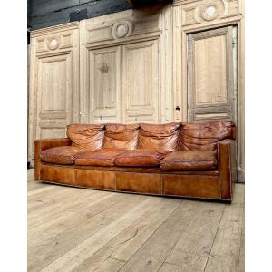 4-seater Sofa In Studded Full-grain Leather, Single-panel Back And Feather Cushions