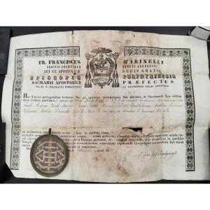 The reliquary is accompanied by its original Certificate of Authenticity (COA), issued and signed by His Eminence Francois Marinelli, Bishop of Porphyreon, verifying its authenticity and sacred origin.