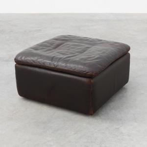 The pouf features a generous, plush seat with natural folds and a warm patina acquired over time; subtle marks of use that underline the authenticity and character of the piece. Its low, uncluttered profile and sturdy construction make it a versatile addition to any interior, whether paired with a matching De Sede lounge chair or used on its own.