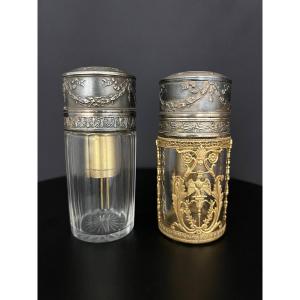 The second, more sober bottle features a metal mount decorated with classical friezes, forming a harmonious pair.