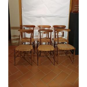 Elegant set of six miniature chairs, crafted from finely carved solid walnut and featuring seats upholstered in Vienna straw. The chairs are distinctive and charming, featuring straight, molded legs with crossbars and a carved backrest with a curved, geometric shape. This is a collection of chairs of great taste and refinement, capable of adding a touch of class and antiquity to any setting. The chairs are in excellent condition regarding the wood, though they show slight imperfections in the straw seating. Made in Liguria (Chiavari, Liguria, central Italy) in the late 19th century.