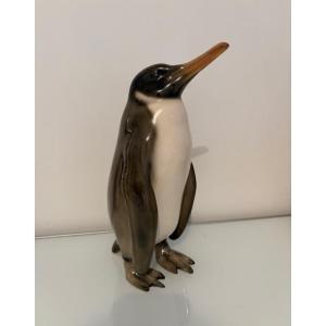 Polychrome ceramic sculpture made using the slip-casting technique, depicting a penguin, decorated with airbrushing beneath the glaze, Zaccagnini, 1930s./1940s