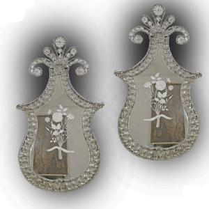 Elegant pair of drop-shaped mirrors from the neoclassical period. These mirrors feature a frame adorned with crystals set in almond shapes, beads, and floral motifs. The ornate crest displays a floral cluster decoration, also enhanced with crystals. The mirror glass is etched with a delightful floral design, depicting a bouquet of flowers with a prominently visible rose at the center. Originally conceived as appliques, the mirrors are distinguished by their modest size andare in excellent condition. Very elegant and refined, they can tastefully enhance any environment. Tuscan craftsmanship dating back to the late 18thcentury.